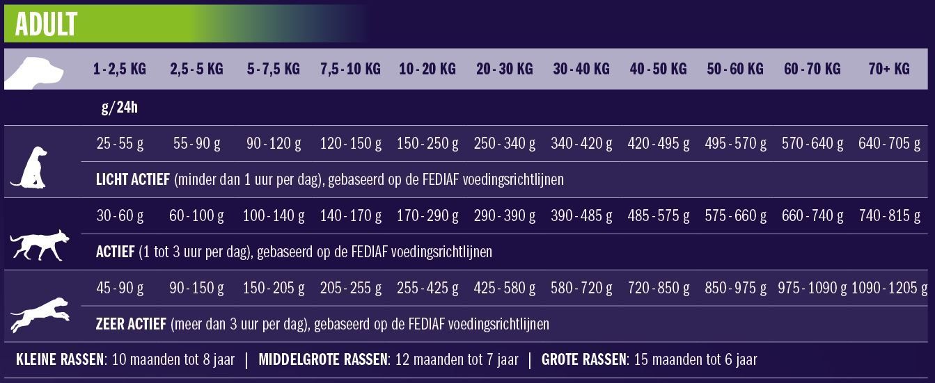 In onderstaand voerschema vind je heel gemakkelijk een passende voergift voor je hond. Zoek in de bovenste balk het actuele gewicht van je hond en kies daar de juiste leeftijd in maanden bij. Je ziet nu heel eenvoudig een geschikte voergift voor je hond per dag. Volg het voedingsschema in de tabel, maar pas eventueel het schema aan om het ideale gewicht van je hond te handhaven. Verdeel de dagelijkse hoeveelheid voer over twee of meer maaltijden per dag.