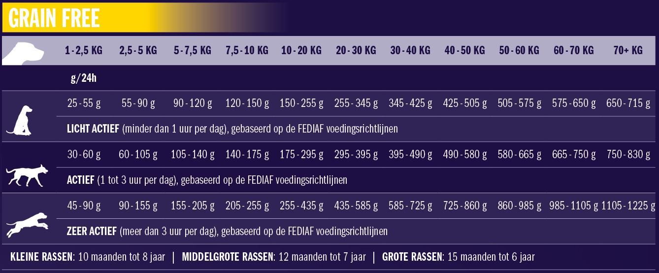 In onderstaand voerschema vind je heel gemakkelijk een passende voergift voor je hond. Zoek in de bovenste balk het actuele gewicht van je hond en kies daar de juiste leeftijd in maanden bij. Je ziet nu heel eenvoudig een geschikte voergift voor je hond per dag. Volg het voerschema in de tabel, maar pas eventueel het schema aan om het ideale gewicht van je hond te handhaven. Verdeel de dagelijkse hoeveelheid voer over twee of meer maaltijden per dag.