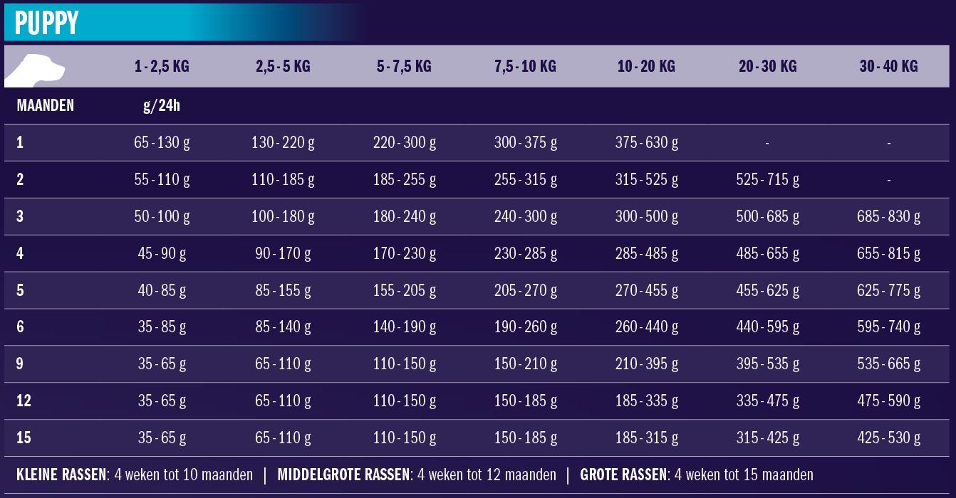 In onderstaand voerschema vind je heel gemakkelijk een passende voergift voor je pup. Zoek in de bovenste balk het actuele gewicht van je hond en kies daar de juiste leeftijd in maanden bij. Je ziet nu heel eenvoudig een geschikte dagelijkse voergift voor je puppy. Volg het voedingsschema in de tabel, maar pas eventueel het schema aan om het ideale gewicht van je puppy te handhaven. Verdeel de dagelijkse hoeveelheid voer over twee of meer maaltijden per dag.