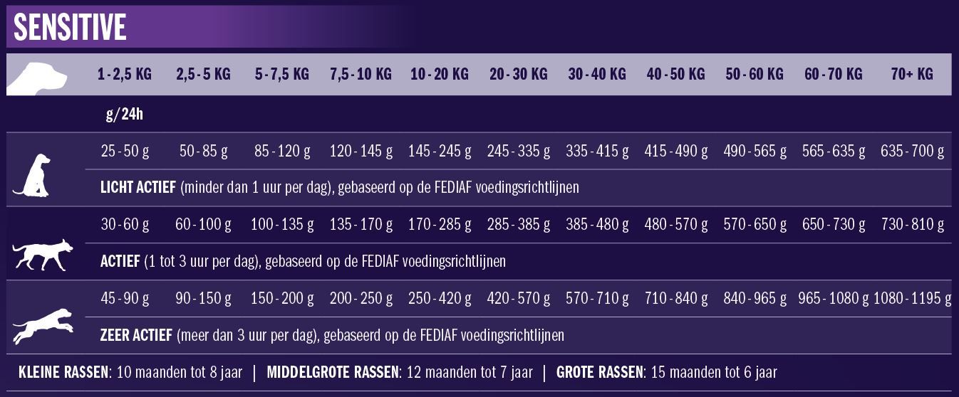 In onderstaand voerschema vind je heel gemakkelijk een passende voergift voor je hond. Zoek in de bovenste balk het actuele gewicht van je hond en kies daar de juiste leeftijd in maanden bij. Je ziet nu heel eenvoudig een geschikte voergift voor je hond per dag. Volg het voerschema in de tabel, maar pas eventueel het schema aan om het ideale gewicht van je hond te handhaven. Verdeel de dagelijkse hoeveelheid voer over twee of meer maaltijden per dag.